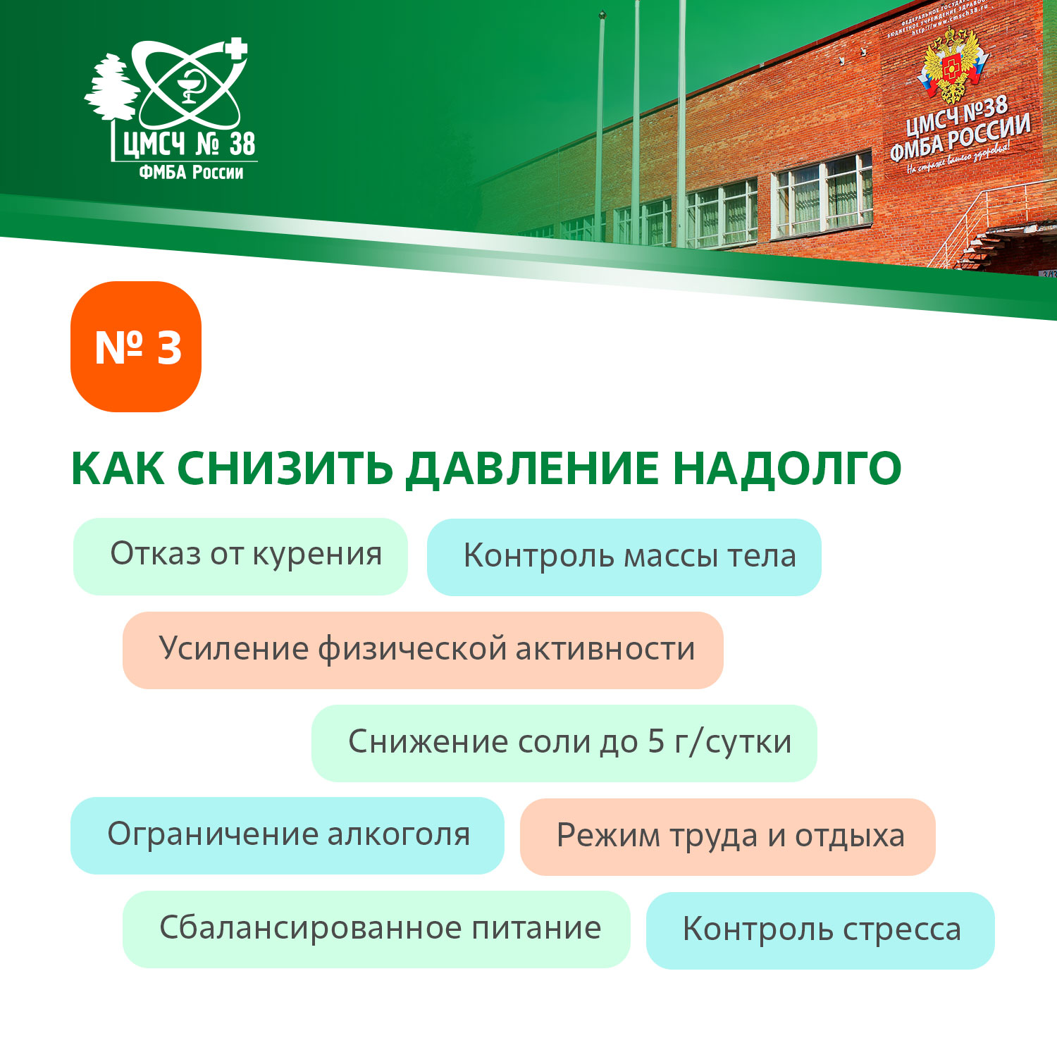 Отказ от курения, контроль массы тела, усиление физической активности, снижение соли до 5 г в сутки, сбалансированное питание, ограничение алкоголя, режим труда и отдыха, контроль стресса.