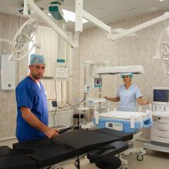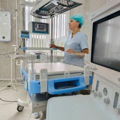 Хирургическое отделение с современным операционным блоком оснащено всем необходимым оборудованием – эргономичные столы с электроприводом, наркозно-дыхательные аппараты, эндоскопическая стойка для малоинвазивных хирургических и гинекологических операций, цифровая С-дуга, следящая аппаратура. Здесь обеспечена подача всех необходимых медицинских газов. Кроме того, одна из операционных укомплектована реанимационным столом для новорожденных с возможностью проведения всего комплекса первичной реанимационной помощи новорожденным с соблюдением необходимого температурного климата и проведением вспомогательной вентиляции легких.